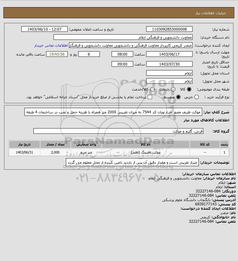 شرح کلی نیاز: موکت ظریف مصور طرح نویان کد 7544 به میزان تقریبی 2000 متر همراه با هزینه حمل و نصب در ساختمان 4 طبقه