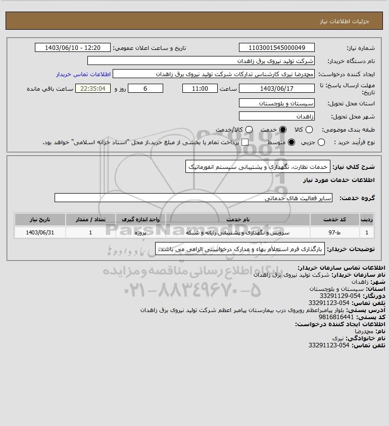 شرح کلی نیاز: خدمات نظارت، نگهداری و پشتیبانی سیستم انفورماتیک