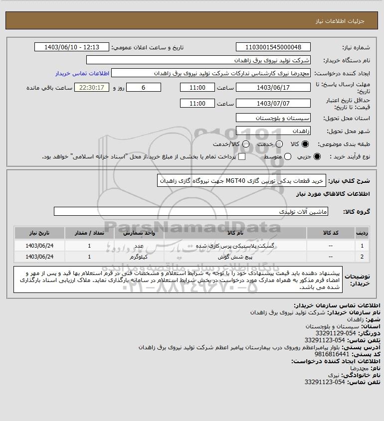 شرح کلی نیاز: خرید قطعات یدکی توربین گازی MGT40 جهت نیروگاه گازی زاهدان