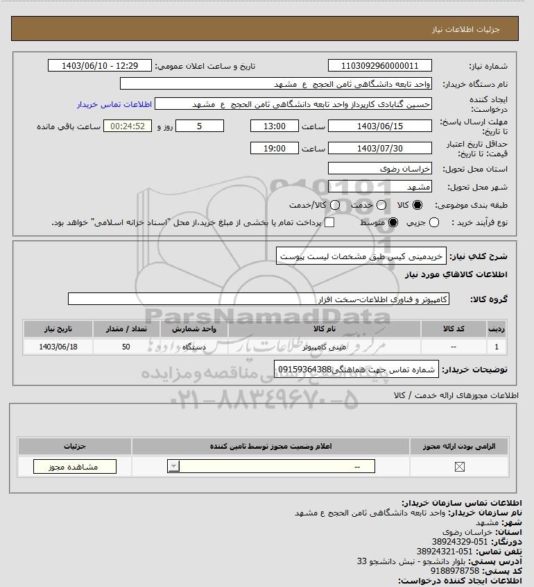 نام دستگاه خریدار:واحد تابعه دانشگاهی ثامن الحجج ع مشهد