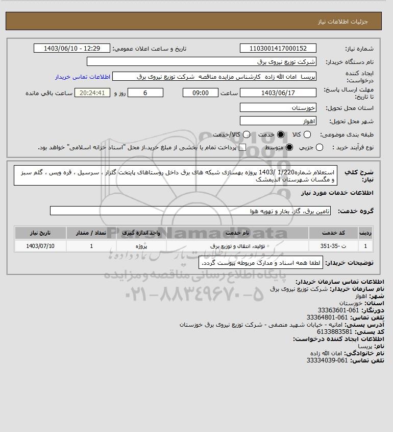 شرح کلی نیاز: استعلام شماره1/220 /1403