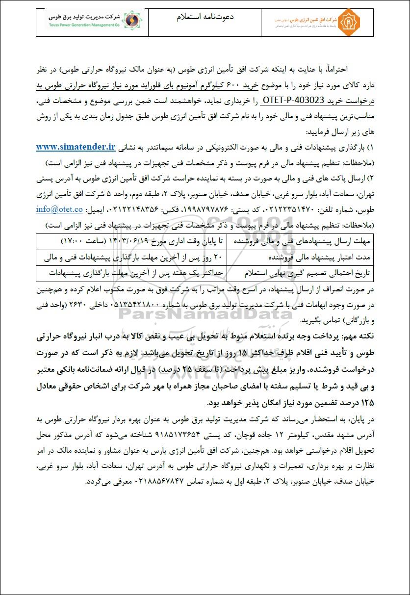 احتراماً با عنایت به اینکه شرکت افق تأمین انرژی طوس (به عنوان مالک نیروگاه حرارتی طوس) در نظر دارد کالای مورد نیاز خود را با موضوع خرید 600 کیلوگرم آمونیوم بای فلوراید مورد نیاز نیروگاه حرارتی طوس به درخواست خرید 403023-OTET-P را خریداری نماید. خواهشمند است ضمن بررسی موضوع و مشخصات فنی، مناسب ترین پیشنهاد فنی و مالی خود را به نام شرکت افق تأمین انرژی طوس طبق جدول زمان بندی به یکی از روش های زیر ارسال فرمایید:
