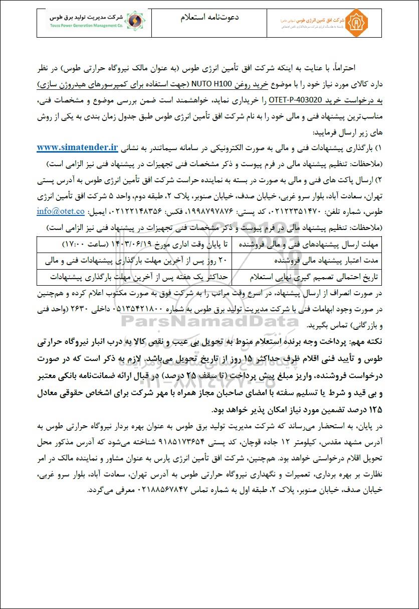 احتراماً با عنایت به اینکه شرکت افق تأمین انرژی طوس (به عنوان مالک نیروگاه حرارتی طوس) در نظر دارد کالای مورد نیاز خود را با موضوع خرید روغن NUTO H100 مورد نیاز نیروگاه حرارتی طوس به درخواست خرید 403020-OTET-P را خریداری نماید. خواهشمند است ضمن بررسی موضوع و مشخصات فنی، مناسب ترین پیشنهاد فنی و مالی خود را به نام شرکت افق تأمین انرژی طوس طبق جدول زمان بندی به یکی از روش های زیر ارسال فرمایید: