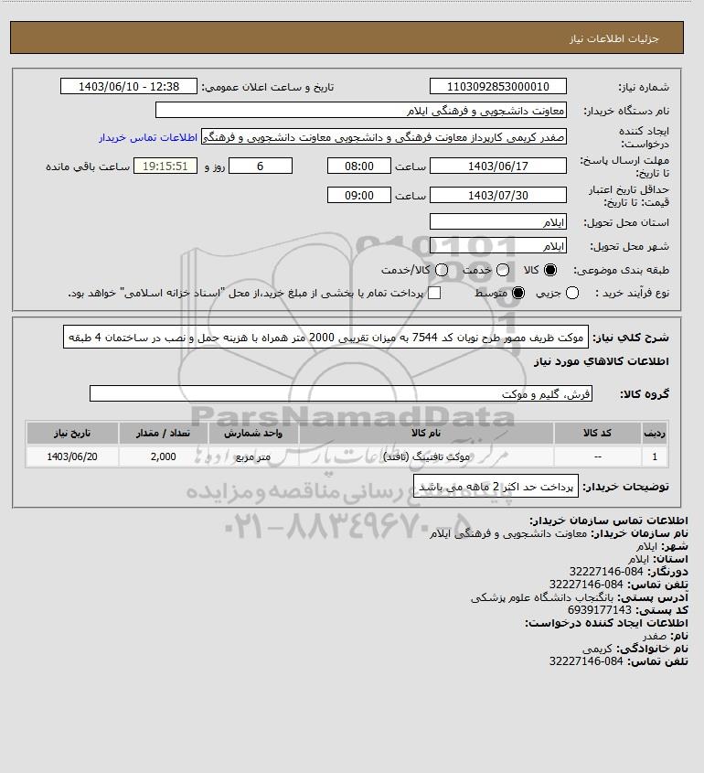 شرح کلی نیاز: موکت ظریف مصور طرح نویان کد 7544 به میزان تقریبی 2000 متر همراه با هزینه حمل و نصب در ساختمان 4 طبقه