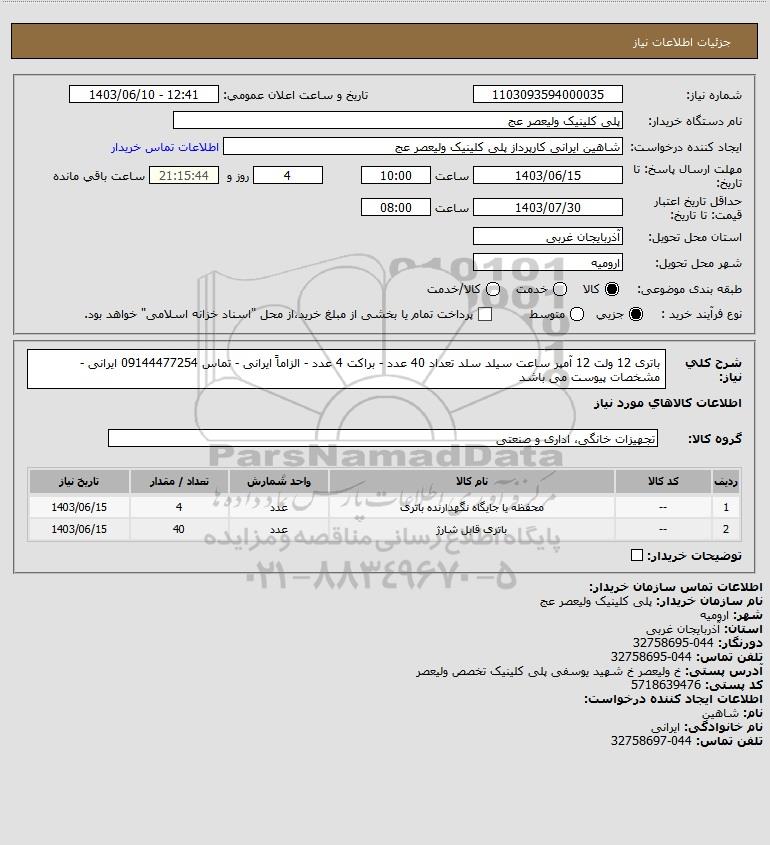شرح کلی نیاز: باتری 12 ولت 12 آمپر ساعت سیلد سلد تعداد 40 عدد - براکت 4 عدد - الزاماً ایرانی - تماس 09144477254 ایرانی - مشخصات پیوست می باشد