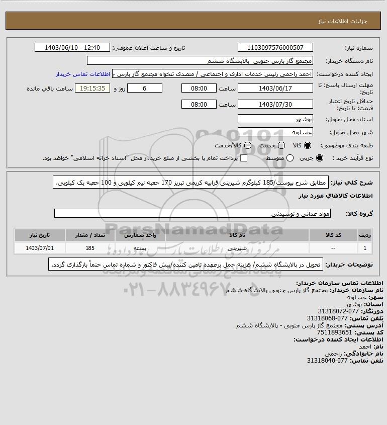 نام دستگاه خریدار:مجتمع گاز پارس جنوبی پالایشگاه ششم