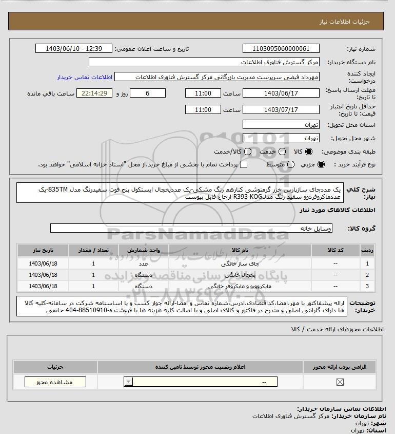 شرح کلی نیاز: یک عددچای سازپارس خزر گرمنوشی کنارهم رنگ مشکی-یک عددیخچال ایستکول پنج فوت سفیدرنگ مدل 835TM-یک عددماکروفردوو سفید رنگ مدلR393-KOG-ارجاع فایل پیوست