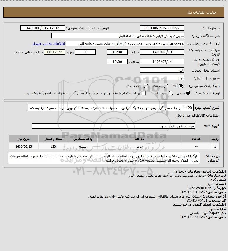 شرح کلی نیاز: 120 کیلو چای سر گل مرغوب و درجه یک ایرانی. محصول سال جاری. بسته 1 کیلویی. ارسال نمونه الزامیست.