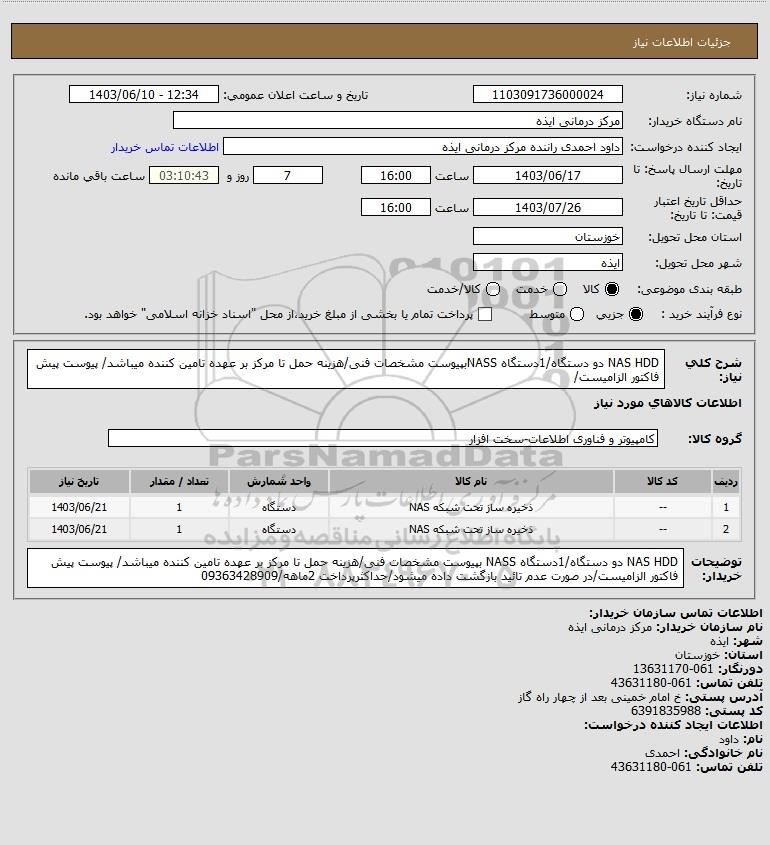 شرح کلی نیاز: NAS HDD دو دستگاه/1دستگاه NASSبپیوست مشخصات فنی/هزینه حمل تا مرکز بر عهده تامین کننده میباشد/ پیوست پیش فاکتور الزامیست/