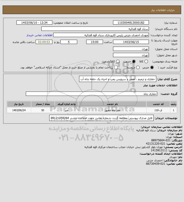 شرح کلی نیاز: حفاری و ترمیم ، تعمیر و سرویس پمپ و احیاء یک حلقه چاه آب