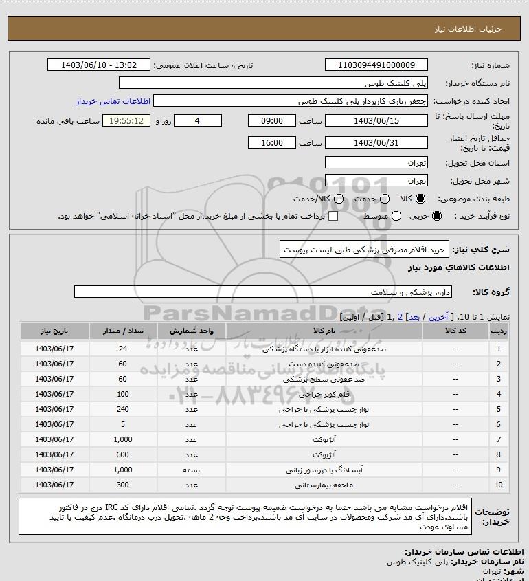 شرح کلی نیاز: خرید اقلام مصرفی پزشکی طبق لیست پیوست