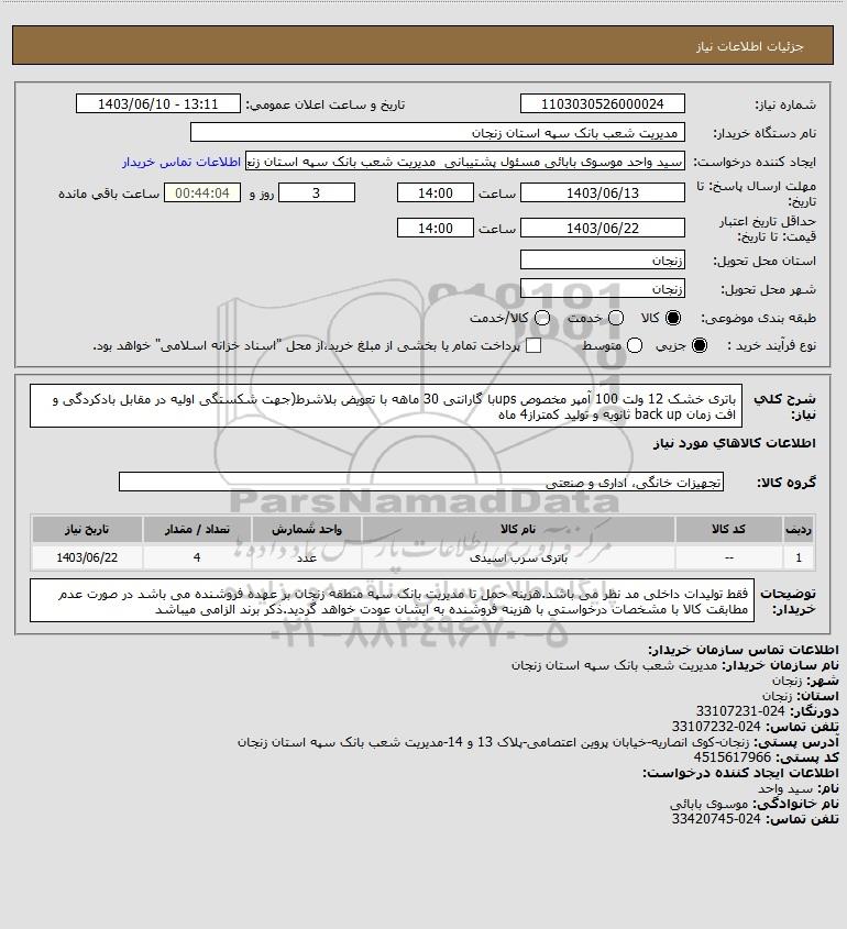 نام دستگاه خریدار: مدیریت شعب بانک سپه استان زنجان