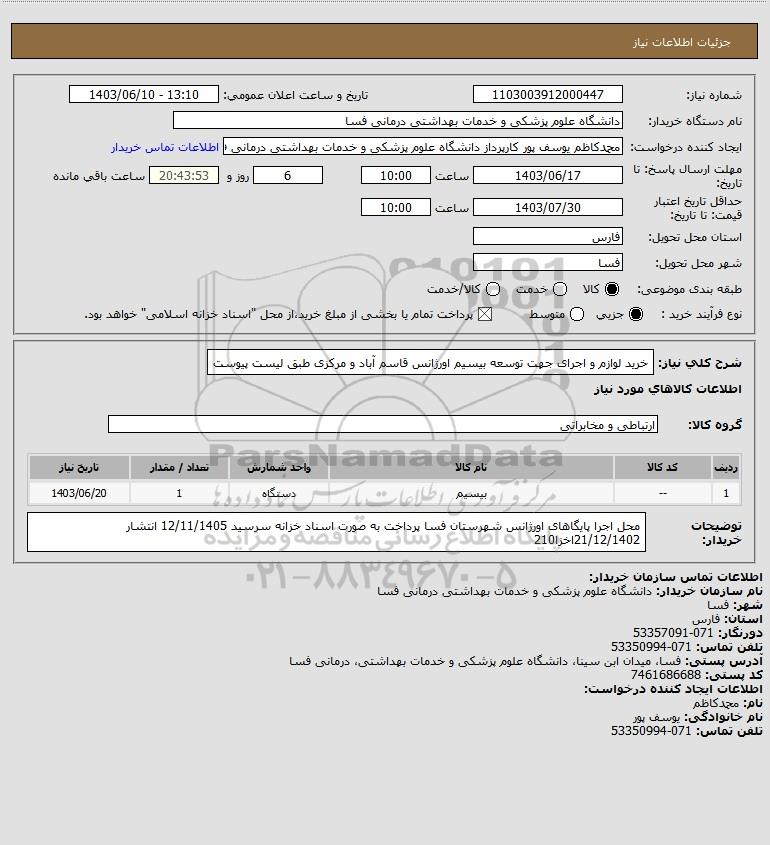 توضیحات خریدار:محل اجرا پایگاهای اورژانس شهرستان فسا پرداخت به صورت اسناد خزانه سرسید 12/11/1405 انتشار 21/12/1402اخزا210