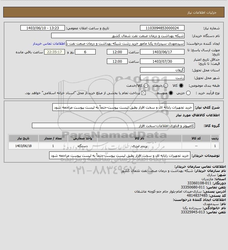 نام دستگاه خریدار:شبکه بهداشت و درمان صنعت نفت شمال کشور