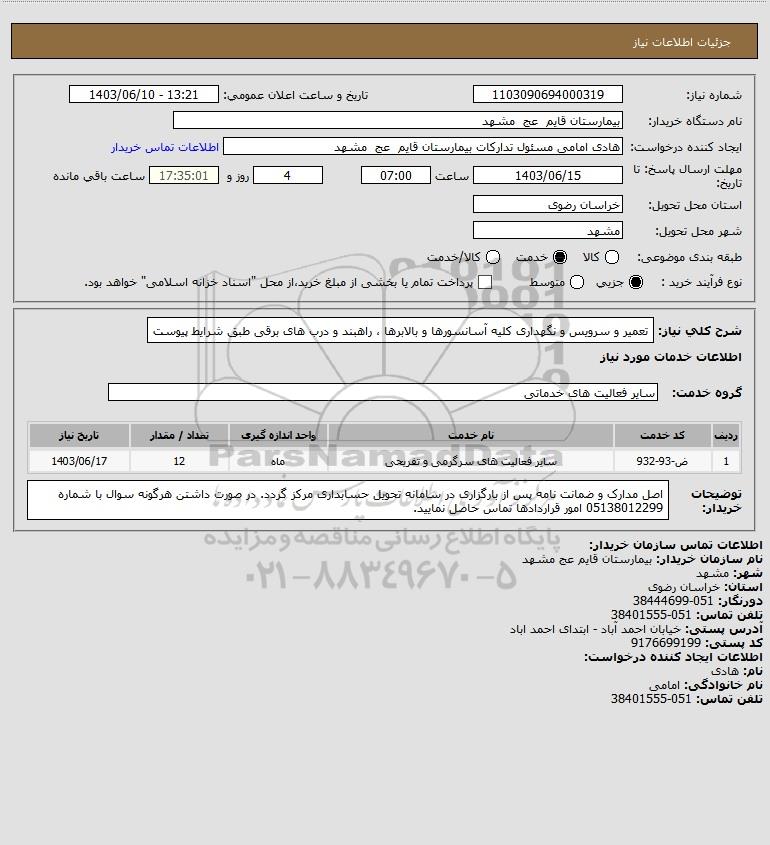 شرح کلی نیاز: تعمیر و سرویس و نگهداری کلیه آسانسورها و بالابرها ، راهبند و درب های برقی طبق شرایط پیوست