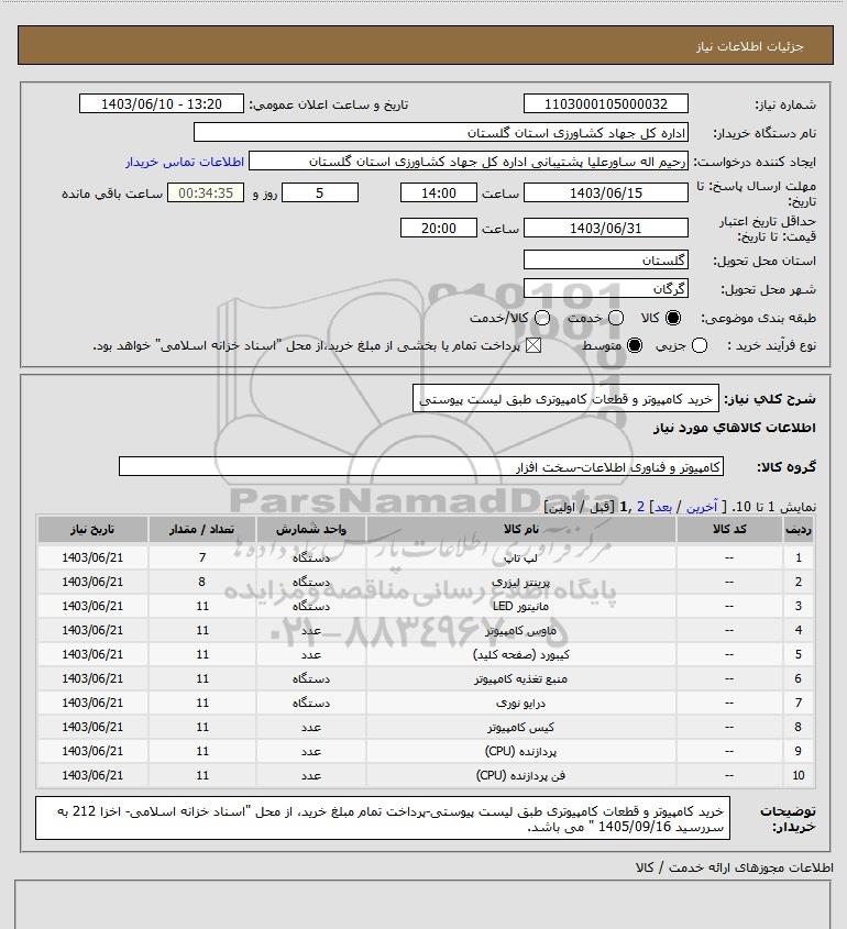 شرح کلی نیاز: خرید کامپیوتر و قطعات کامپیوتری طبق لیست پیوستی