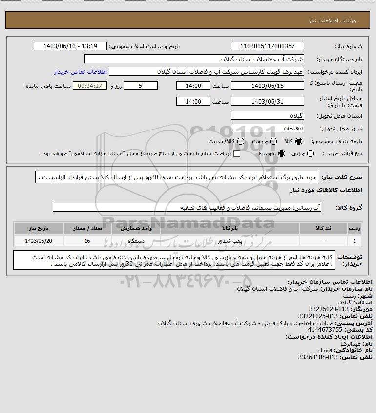 نام دستگاه خریدار:شرکت آب و فاضلاب استان گیلان