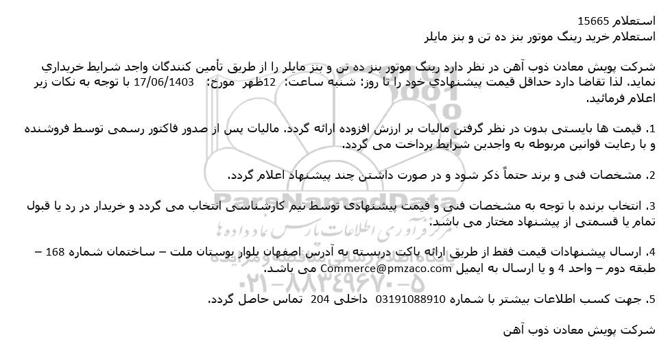شرکت پويش معادن ذوب آهن در نظر دارد رینگ موتور بنز ده تن و بنز مایر را از طريق تامین کنندگان واجد شرايط خريداری نمايد. لذا تقاضا دارد حداقل قيمت پيشنهادي خود را تا روز: شنبه ساعت: 12 ظهر مورخ: 1403.6.17 با توجه به نكات زير اعلام فرمائيد.