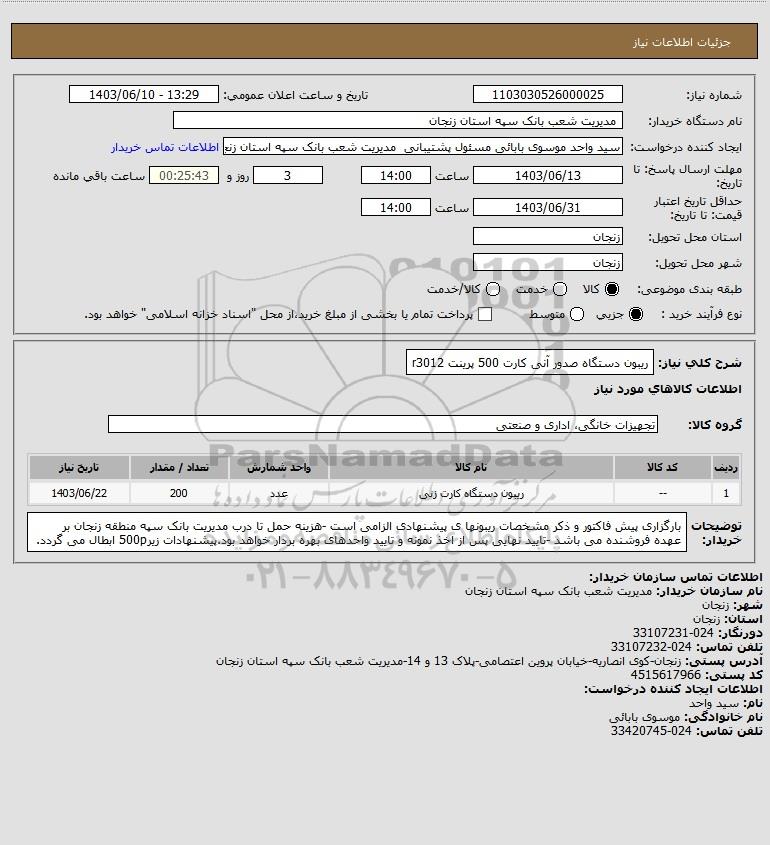 شرح کلی نیاز: ریبون دستگاه صدور آنی کارت 500 پرینت r3012