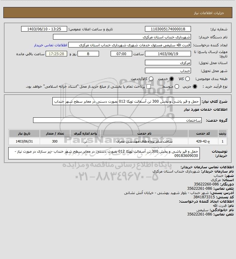 شرح کلی نیاز: حمل و قیر پاشی و پخش 300 تن آسفالت توپکا 012 بصورت دستی در معابر سطح شهر خنداب