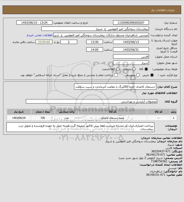 شرح کلی نیاز: دستمال کاغذی جعبه 200برگ با علامت استاندارد و سیب سلامت