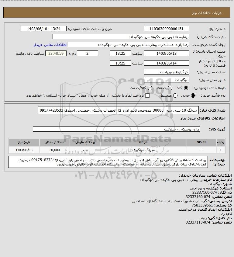 شرح کلی نیاز: سرنگ 10 سی سی 30000 عدد-مورد تایید اداره کل تجهیزات پزشکی -مهندس احمدی 09177423533