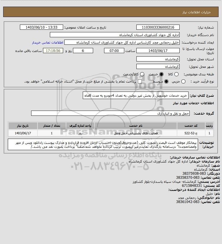 شرح کلی نیاز: خرید خدمات خودرویی از بخش غیر دولتی به تعداد 4خودرو به مدت 8ماه