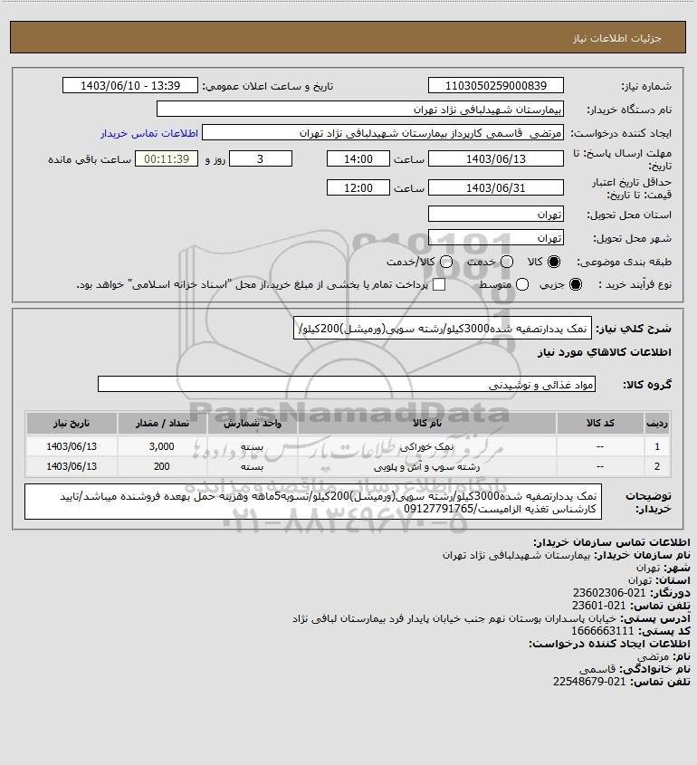 شرح کلی نیاز: نمک یددارتصفیه شده3000کیلو/رشته سوپی(ورمیشل)200کیلو/