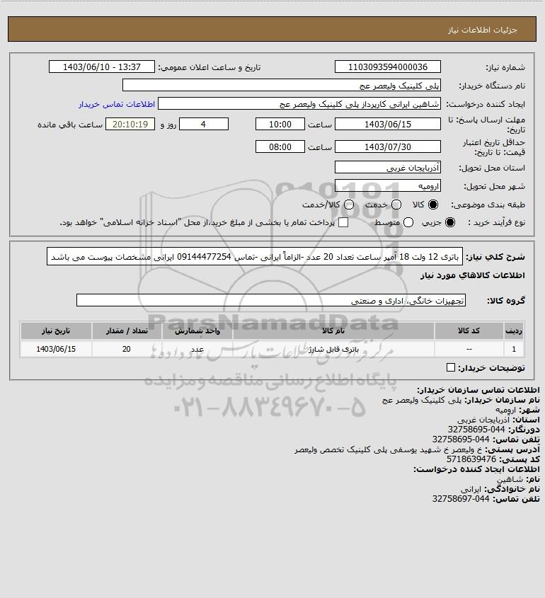 استعلام باتری 12 ولت 18 آمپر ساعت تعداد 20 عدد -الزاماً ایرانی -تماس 09144477254 ایرانی مشخصات پیوست می باشد, استعلام باتری 12 ولت 18 آمپر ساعت تعداد 20 عدد -الزاماً ایرانی -تماس 09144477254 ایرانی مشخصات پیوست می باشد