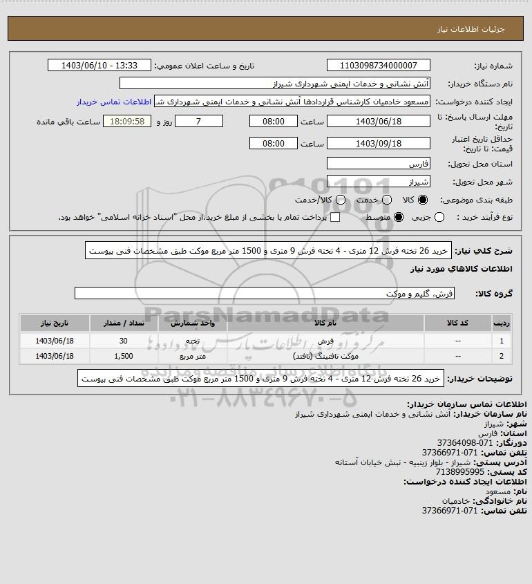شرح کلی نیاز: خرید 26 تخته فرش 12 متری - 4 تخته فرش 9 متری و 1500 متر مربع موکت طبق مشخصات فنی پیوست