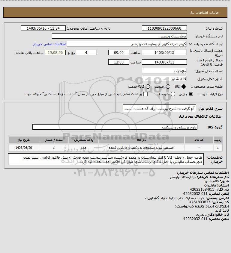 نام دستگاه خریدار:بیمارستان ولیعصر