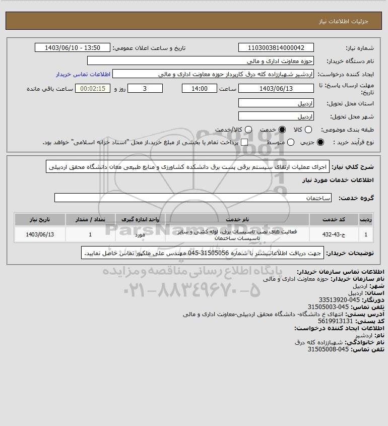 شرح کلی نیاز: اجرای عملیات ارتقای سیستم برقی پست برق دانشکده کشاورزی و منابع طبیعی مغان دانشگاه محقق اردبیلی