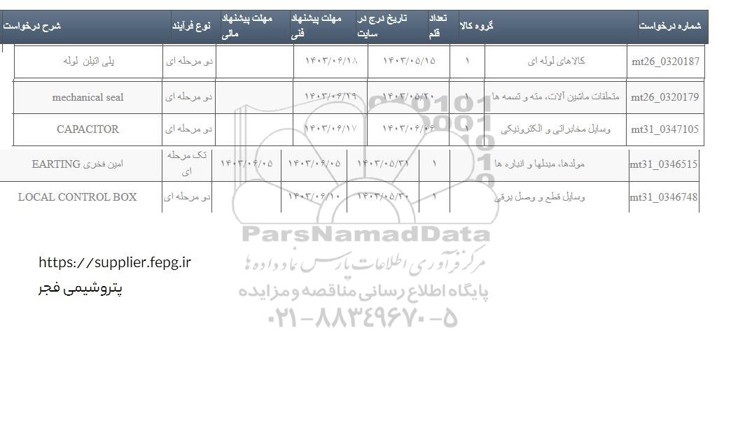 شماره درخواست   گروه کالا تعداد قلم مهلت پیشنهاد