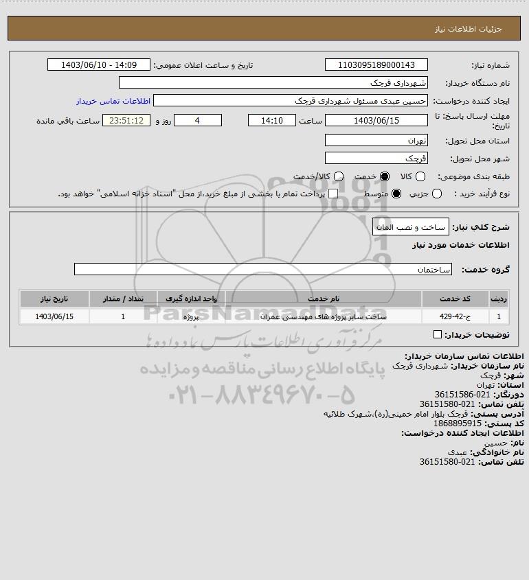 استعلام بها و موضوع استعلام استعلام ساخت و نصب المان به اطلاع کلیه شرکتها و افراد متخصص واجد شرایط میرساند، آگهی گذار در نظر دارد از طریق استعلام بها، نسبت به انتخاب و دریافت پیشنهادات اقدام نماید. این استعلام با کد آگهی ثبت شده در سامانه خبرگزاری پارس نماد : 7943124 منتشر شده است. مشخصات استعلام : تاریخ شروع استعلام: 1403/06/10 آخرین مهلت ارسال پیشنهاد قیمت : 1403/06/15 و محل اجرای پروژه : استان تهران میباشد. استعلام قیمت مورد درخواست : استعلام ساخت و نصب المان با دستهبندیهای تخصصی و گروه های مرتبط : تجهیزات پارک و مبلمان شهری, ساختمان, استعلام اطلاع رسانی میگردد.