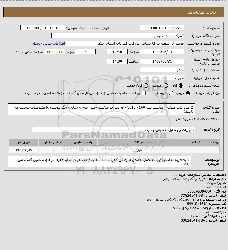 استعلام بها و موضوع استعلام استعلام 2 عدد کانتر منشی مدست تیپ 801L - 160 - ام دی اف ملامینه -طبق طرح و سایز و رنگ پیوستی-(مشخصات پیوست می باشد) به اطلاع کلیه شرکتها و افراد متخصص واجد شرایط میرساند، آگهی گذار در نظر دارد از طریق استعلام بها، نسبت به انتخاب و دریافت پیشنهادات اقدام نماید. این استعلام با کد آگهی ثبت شده در سامانه خبرگزاری پارس نماد : 7943233 منتشر شده است. مشخصات استعلام : تاریخ شروع استعلام: 1403/06/10 آخرین مهلت ارسال پیشنهاد قیمت : 1403/06/13 و محل اجرای پروژه : استان ایلام میباشد. استعلام قیمت مورد درخواست : استعلام 2 عدد کانتر منشی مدست تیپ 801L - 160 - ام دی اف ملامینه -طبق طرح و سایز و رنگ پیوستی-(مشخصات پیوست می باشد) با دستهبندیهای تخصصی و گروه های مرتبط : مصنوعات چوبی و مبلمان اداری, استعلام اطلاع رسانی میگردد.
