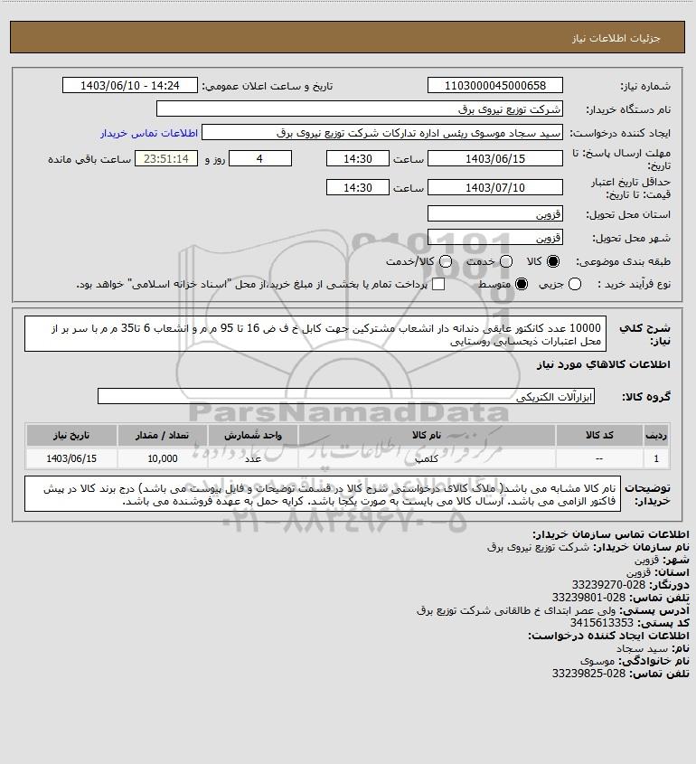 شرح کلی نیاز: 10000 عدد کانکتور عایقی دندانه دار انشعاب مشترکین جهت کابل خ ف ض 16 تا 95 م م و انشعاب 6 تا35 م م با سر بر از محل اعتبارات ذیحسابی روستایی
