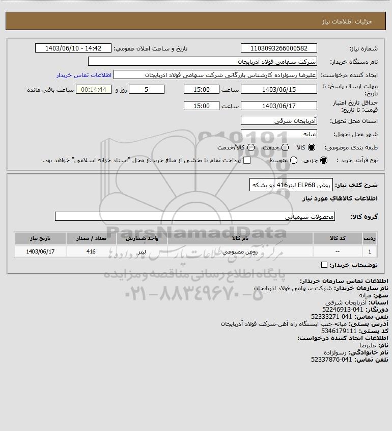 شرح کلی نیاز: روغن ELP68 لیتر416 دو بشکه