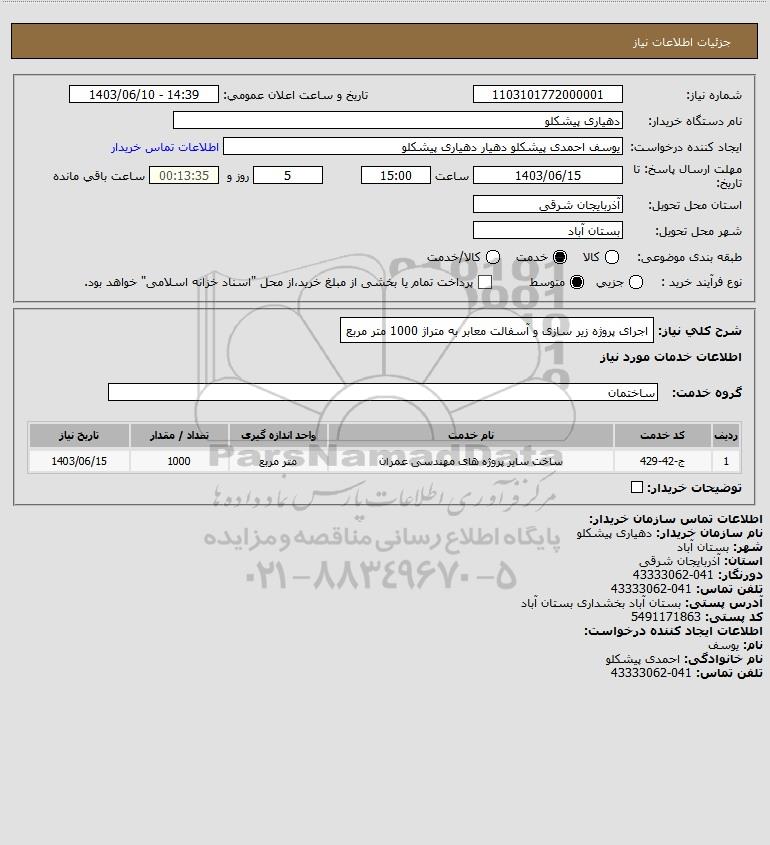 شرح کلی نیاز: اجرای پروژه زیر سازی و آسفالت معابر به متراژ 1000 متر مربع