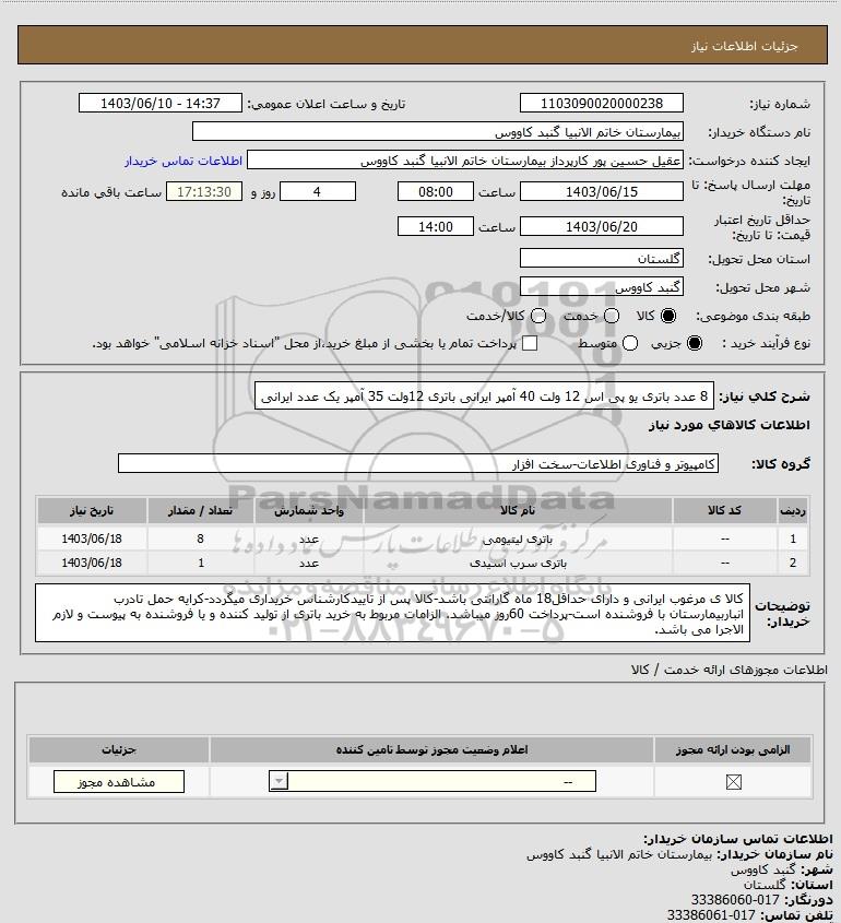 نام سازمان خریدار: بیمارستان خاتم الانبیا گنبد کاووس