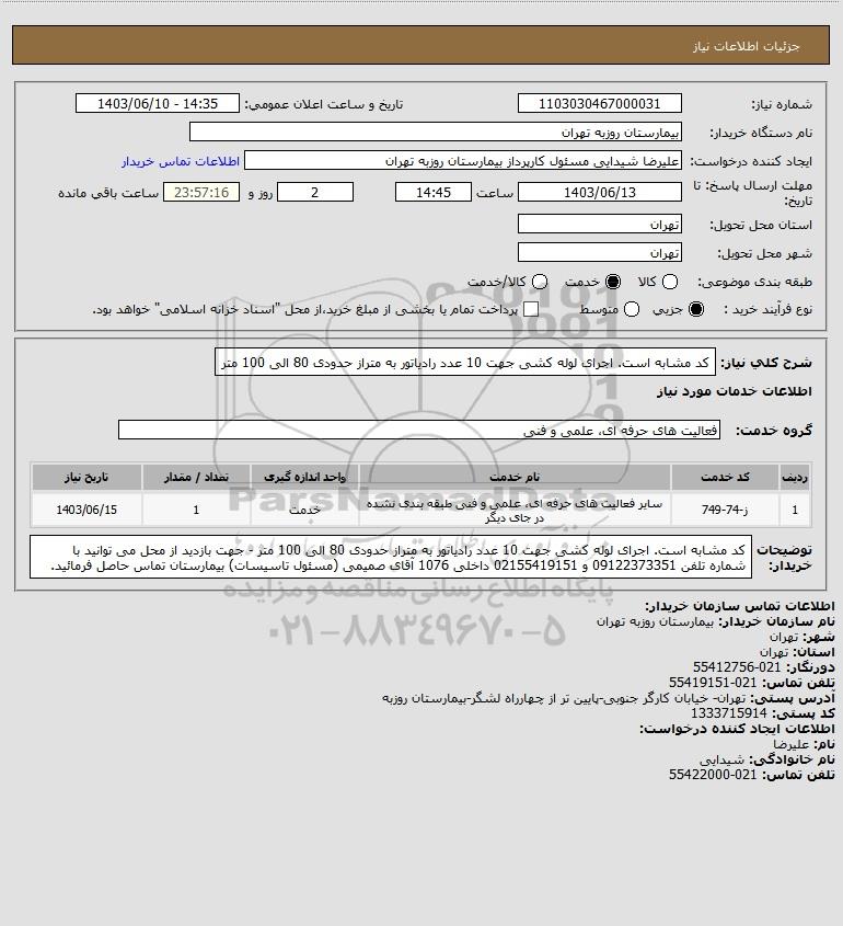 توضیحات خریدار:کد مشابه است. اجرای لوله کشی جهت 10 عدد رادیاتور به متراز حدودی 80 الی 100 متر - جهت بازدید از محل می توانید با شماره تلفن 09122373351 و 02155419151 داخلی 1076 آقای صمیمی (مسئول تاسیسات) بیمارستان تماس حاصل فرمائید.