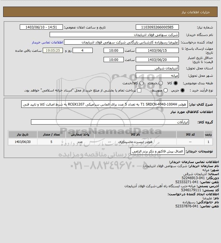 شرح کلی نیاز: هولدر T1 SRDCN-4040-1004H به تعداد 5 عدد برای الماس سرامیکی RCGX1207 به شرط اصالت کالا و تایید فنی
