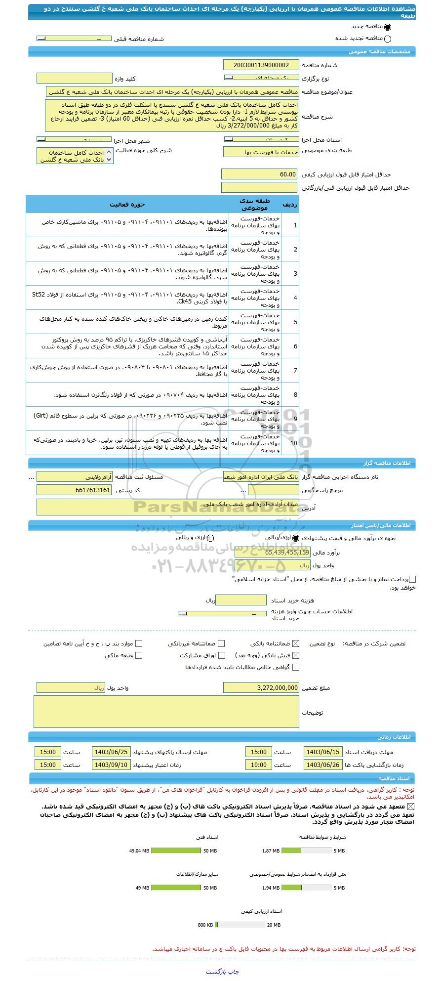 | شرح مناقصه | احداث کامل ساختمان بانک ملی شعبه خ گلشن سنندج با اسکلت فلزی در دو طبقه طبق اسناد پیوستی شرایط لازم 1- دارا بودن شخصیت حقوقی با رتبه پیمانکاری معتبر از سازمان برنامه و بودجه کشور و حداقل به 5 ابنیه.2- کسب حداقل نمره ارزیابی فنی (حداقل 60 امتیاز) 3- تضمین فرایند ارجاع کار به مبلغ 3/272/000/000 ریال | |||||||||||||||||||||||||||||||||||