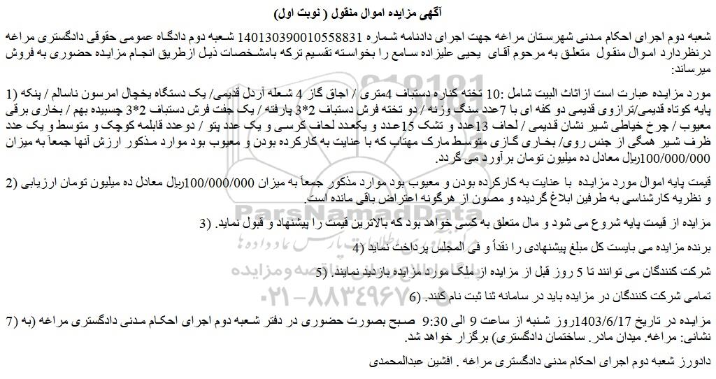 شعبه دوم اجرای احکام مدنی شهرستان مراغه جهت اجرای دادنامه شماره 140130390010558831 شعبه دوم دادگاه عمومی حقوقی دادگستری مراغه درنظردارد اموال منقول  متعلق به مرحوم آقای  یحیی علیزاده سامع را بخواسته تقسیم ترکه بامشخصات ذیل ازطریق انجام مزایده حضوری به فروش میرساند: