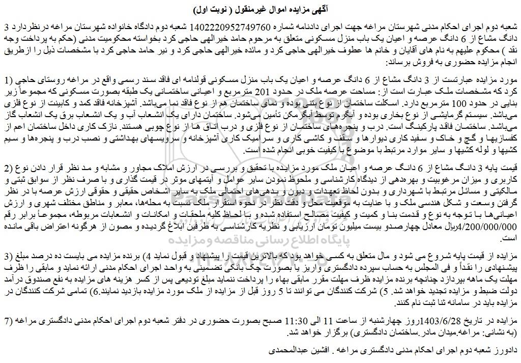 شعبه دوم اجرای احکام مدنی شهرستان مراغه جهت اجرای دادنامه شماره 1402220952749760 شعبه دوم دادگاه خانواده شهرستان مراغه درنظردارد 3 دانگ مشاع از 6 دانگ عرصه و اعیان یک باب منزل مسکونی متعلق به مرحوم حامد خیرالهی حاجی کرد بخواسته محکومیت مدنی (حکم به پرداخت وجه نقد ) محکوم علیهم به نام های آقایان و خانم ها عطوف خیرالهی حاجی کرد و مائده خیرالهی حاجی کرد و نیر حامد حاجی کرد با مشخصات ذیل را ازطریق انجام مزایده حضوری به فروش برساند: