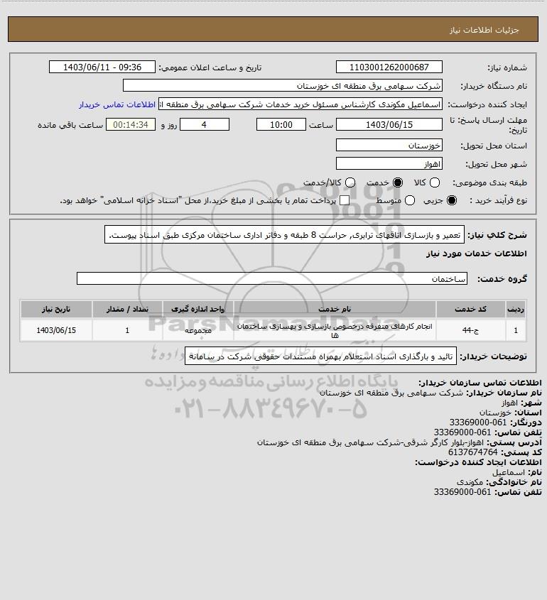 شرح کلی نیاز: تعمیر و بازسازی اتاقهای ترابری, حراست 8 طبقه و دفاتر اداری ساختمان مرکزی طبق اسناد پیوست.