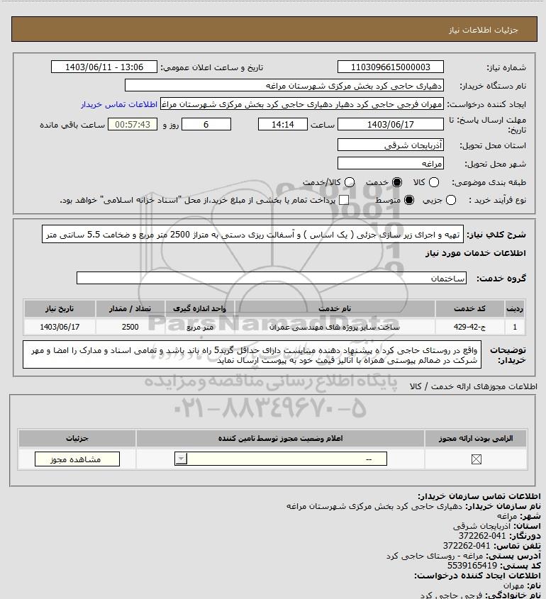 شرح کلی نیاز: تهیه و اجرای زیر سازی جزئی ( یک اساس ) و آسفالت ریزی دستی به متراژ 2500 متر مربع و ضخامت 5.5 سانتی متر