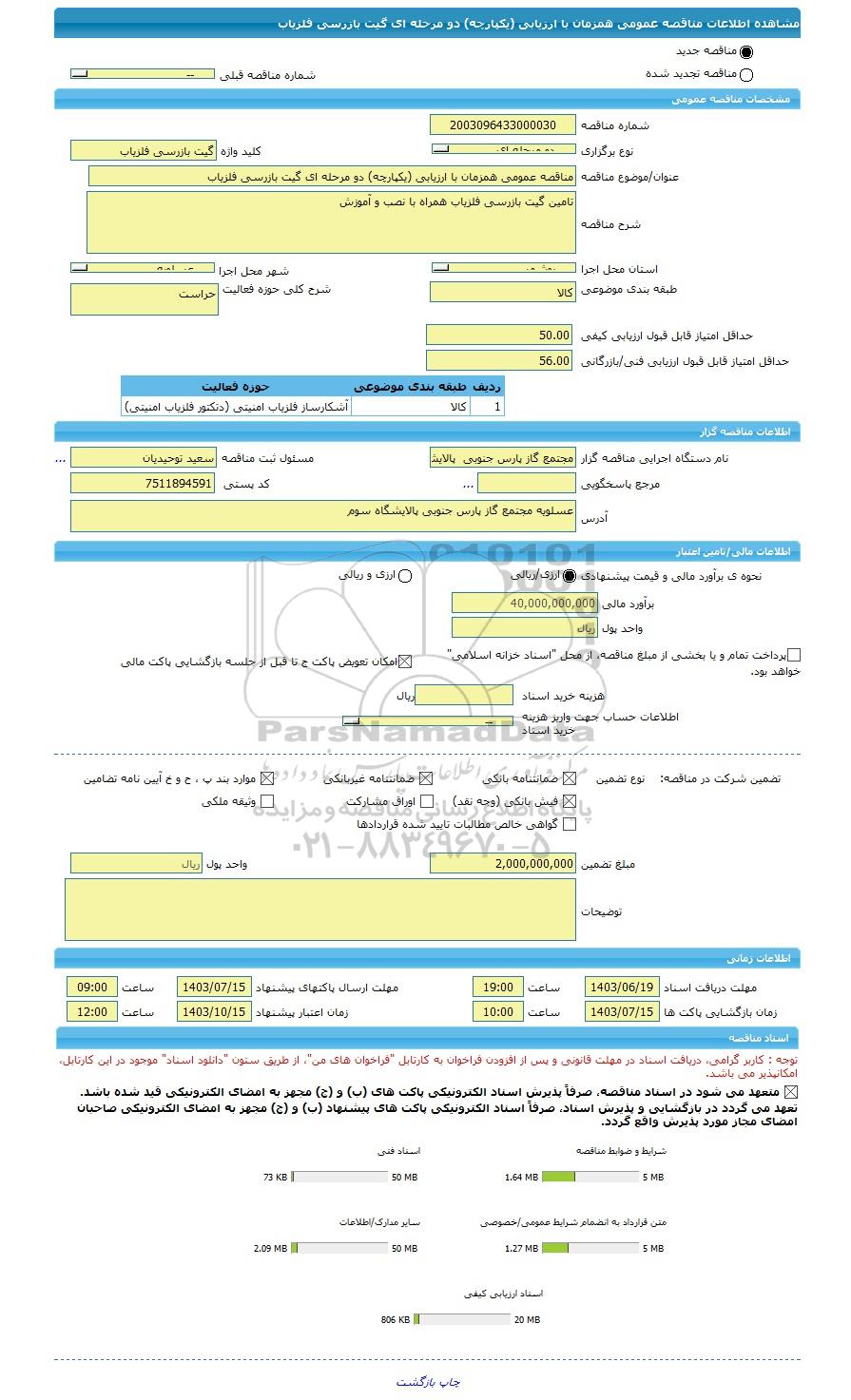 مهلت دریافت اسناد 1403/06/19 ساعت 19:00 مهلت ارسال پاکتهای پیشنهاد 1403/07/15 ساعت 09:00