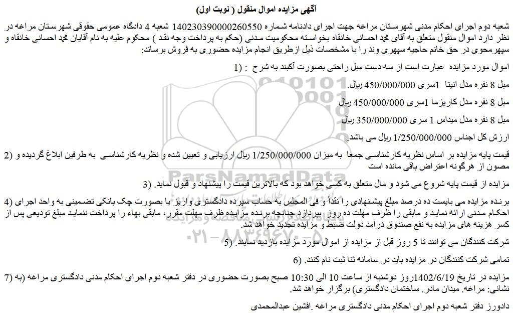 شعبه دوم اجرای احکام مدنی شهرستان مراغه جهت اجرای دادنامه شماره 140230390000260550 شعبه 4 دادگاه عمومی حقوقی شهرستان مراغه در نظر دارد اموال منقول متعلق به آقای محمد احسانی خانقاه بخواسته محکومیت مدنی (حکم به پرداخت وجه نقد ) محکوم علیه به نام آقایان محمد احسانی خانقاه و سپهرمحوی در حق خانم حاجیه سپهری وند را با مشخصات ذیل ازطریق انجام مزایده حضوری به فروش برساند: