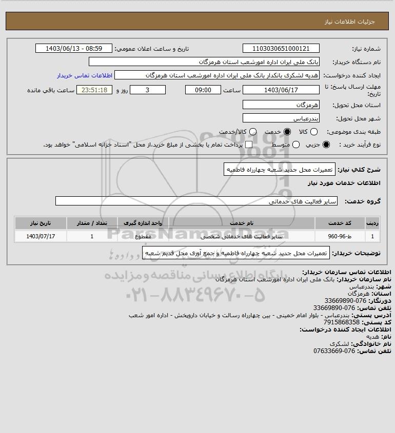 شرح کلی نیاز: تعمیرات محل جدید شعبه چهارراه فاطمیه
