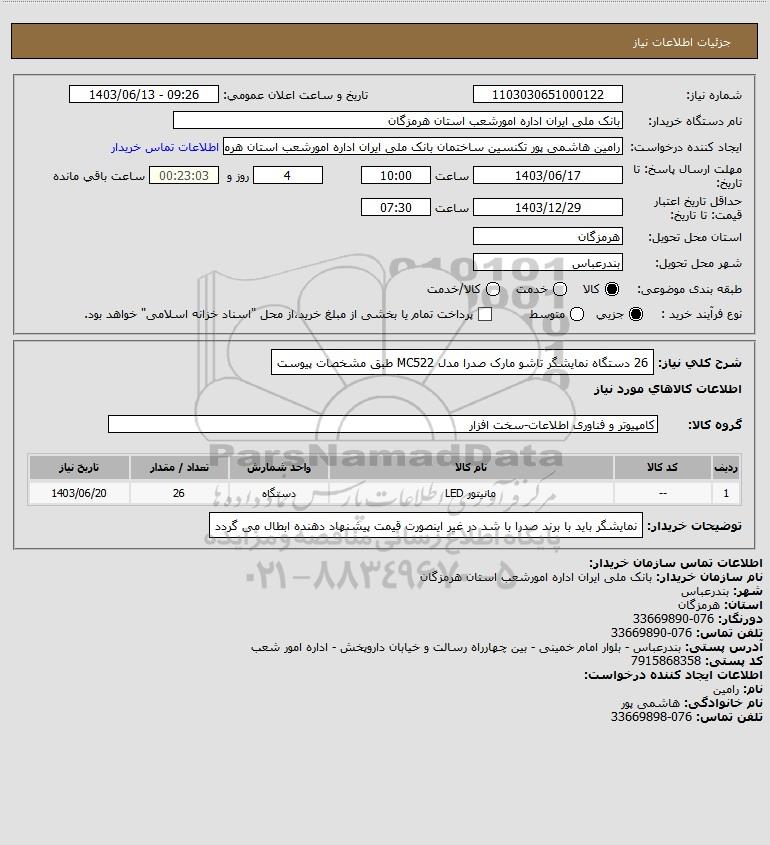 شرح کلی نیاز: 26 دستگاه نمایشگر تاشو مارک صدرا مدل MC522 طبق مشخصات پیوست